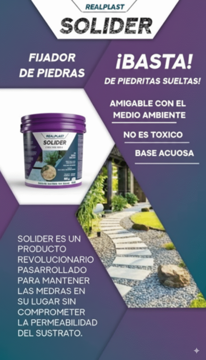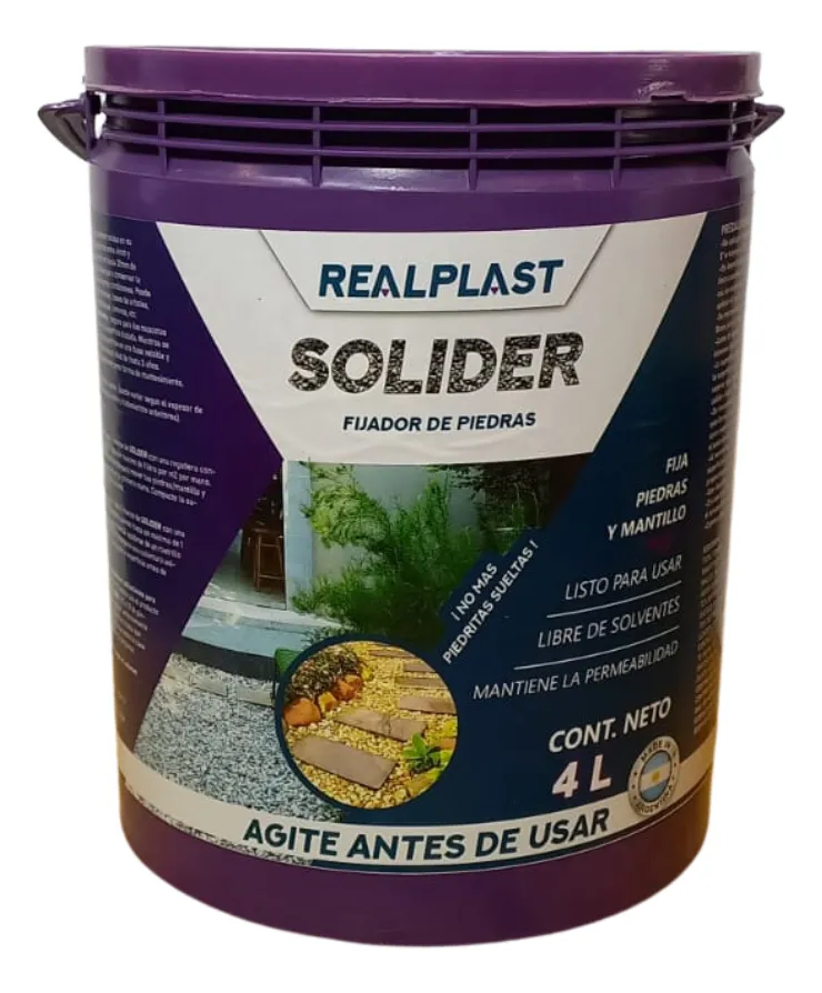 SOLIDER esta diseñado para mantener unidas en su lugar piedras (especialmente efectivo entre 4mm y 10mm) y mantillo (cortezas y pino) en hasta 20mm de profundidad, listo para usar. Es ideal para conservar la decoración de su jardín o paisajismo en las mejores condiciones. Puede usarlo para realizar canteros, macetas, bases de arboles, espacios entre lajas, piedras, baldosas, caminos, etc.